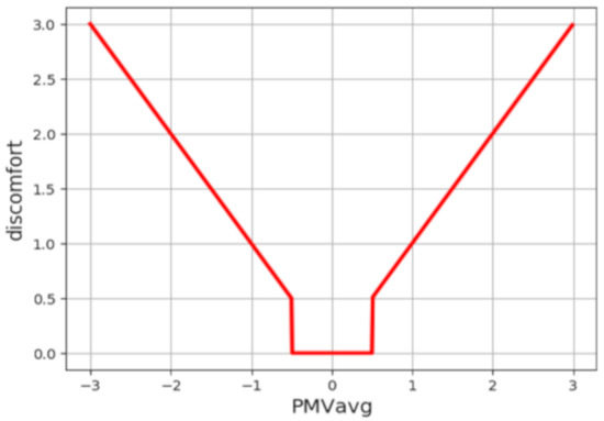 Figure 6 illustrates the relationship between the discomfort and the PMV average value as defined by Equation (10) and Equation (11).