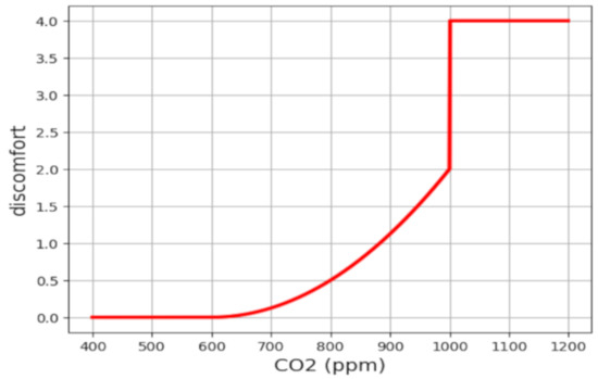 The optimal CO2 concentrations (good: healthy Levels) are usually within the range of [400 ppm, 600 ppm]. For this range, no discomfort is recorded. Above it, the CO2 concentrations become mediocre and even bad for health (see Table 2). For the [600 ppm, 1000 ppm], we opted for a quadratic discomfort that increases faster than a linear one to emphasize the danger of escalating levels of CO2 concentrations. When levels surpass 1000 ppm, the situation becomes dangerous for human health, and thus we raise the discomfort dramatically to restrain the agent from reaching those conditions. The hygienic discomfort versus CO2 concentration, according to Equation (12), is illustrated in Figure 7.