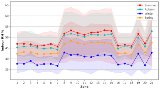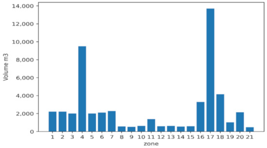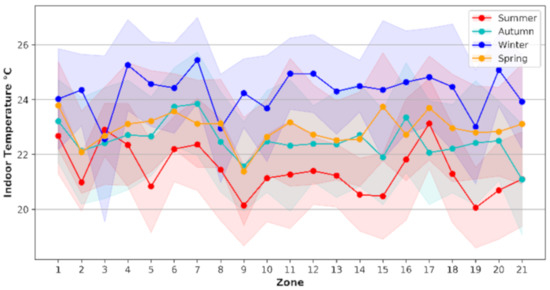 During the simulation, each zone has its characteristics, which increases the complexity of the optimization task. As shown in Figure 8, the 21 zones differ in volume. They also differ in their exposure to direct sun radiations and in the sun-facing angle. Therefore, the optimum temperature setting changes are expected to take place in some zones more significantly than in others.