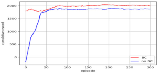With BC, we start with more rewards at the beginning of learning and achieve better results in the long term. This is due to the exploration/exploitation tradeoff. The raw agent tries many variants of decisions until it reaches a good strategy. However, with BC, it learns to perform better than a good baseline from the start.