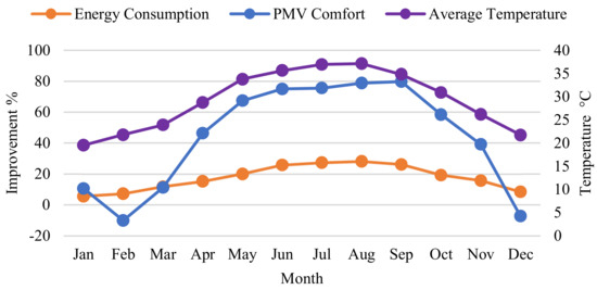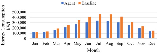 Energy consumption and thermal comfort improvements in different weather conditions are investigated. Energy consumption reduction varies from month to month, but the agent is always capable of decreasing energy consumption, as illustrated in Figure 10.