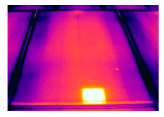 The TNDT method is based on the detection of infrared radiation emitted by objects in proportion to their temperature, according to Planck’s law. The distribution of the surface temperature of the body allows one to determine any anomalies in its operation. The most common malfunction or failure in a PV module is highlighted by an increase in the surface temperature, which can be detectable in thermographic images. Some examples of failure cases are [43] the manufacturing defect, the damage, the bypass diode defect, and faulty interconnection of modules appearing in the thermal image as overheating [44]. However, shadow, dust, and bird droppings also appear in thermographic images as local overheating [45]. Local overheating associated with a fault condition shows a temperature increase in the order of tens of degrees compared to normal operating conditions [15]. This generally has a well-defined geometric and distinguishable shape for the different types of faults [9]. Figure 1 shows a thermographic image acquired on the glass side of the module, displaying the presence of a hot spot due to a failure on the PV cell.