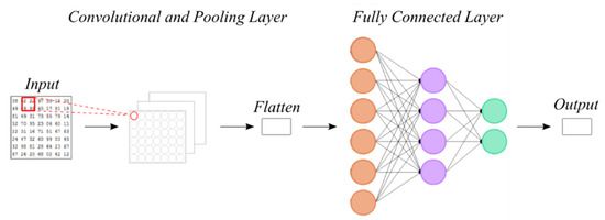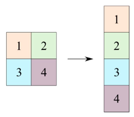 Fully connected layers contain perceptrons that, due to learning, distinguish the characteristics of the inputs and identify the associated class [53]. These layers receive the activation map as a vector due to the flatten function. The flatten function converts the dimension of the activation matrix into a one-dimensional array, and this allows fully connected layers to receive input data; an example of an unrolling arrays is shown in Figure 7.
