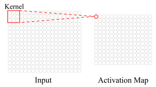 The convolutional layers identify the input characteristics through the application of the convolutional function in the discrete domain. The convolution of the input matrix is realized using a convolutional matrix, called a kernel, applied with a specific application step [51]. The convolutional function is replicated for the entire section of the input matrix and returns a matrix, called an activation map, which contains the representative characteristics of the input [48]. An example of convolution function using a (3, 3) kernel applied in input matrix is shown in Figure 5.