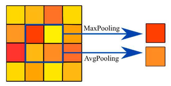 Convolutional layers are alternated with pooling layers, which sample the activation map by reducing its spatial dimensions. In the pooling layers, the matrixes are sampled using a mathematical function, such as Max-pooling or Avg-pooling, which select the pixels with a maximum or average value to highlight specific characteristics of the image [52]; an example of Max-pooling and of Avg-pooling functions is shown in Figure 6.
