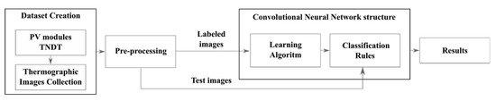 In this study, a CNN was implemented, which is capable of classifying the thermographic images based on the thermal anomalies on the surfaces of the PV modules. The classification was based on the geometric characteristics of local overheating, allowing the CNN to classify thermographic images acquired with different color scales and to distinguish them in the “dust” and “fault” categories. The CNN was developed based on open-source software and tools; in particular, Python programming language and the TensorFlow and Keras libraries were used. The CNN allows the automatic acquisition of training and test images, which are pre-processed through different techniques, and returns as output the probability that the image belongs to a category. CNN operation is shown in Figure 9. In detail, CNN receives as input a set of images collected in a dataset, which are automatically pre-processed to highlight their main recognition characteristics. Subsequently, the images are sent to the CNN’s learning algorithms that vary in terms of parameters and characteristics, according to the quality of the results achieved. A supervised learning classification is performed by assigning a category label to the training images.