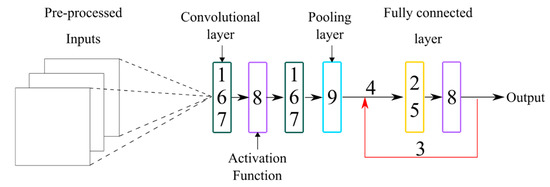 The CNN is a feed-forward network made up of several layers of connected neurons. The layer in the neural network that receives the input is based on the convolution function, hence the name of the CNN. The functioning of the CNN allows numerous applications for image classification, as it is inspired by the organization of the animal visual cortex [50]. The CNN model is generally formed by a succession of layers ruled by different mathematical functions to extract the patterns of image recognition and then classify them [50]; the images are input into the CNN as an array of pixels, the value of which is indicative of the light intensity of the point. A CNN example is shown in Figure 4.