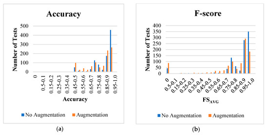 To analyze the predictive performance of the CNN, the confusion matrix was evaluated, which identifies the samples as true negatives (TN) and true positives (TP) where the predicted and real class match, and false negatives (FN) and false positives (FP) where the predicted and real class do not match. In addition, the accuracy (A), the recall (R), the f-score (FS) and the standard deviation were evaluated [63] for each category (0, 1) of each test and the whole system as the mean value of the two categories. The accuracy of a binary classification was calculated according to Equation (3).