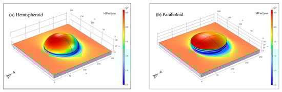 In this section, solar energy potential of gymnasium buildings with four typical symmetric roof shapes is analyzed: gymnasium buildings with hemispheroid, paraboloid, cone-type, and folded plate-type roofs. The structural parameters of these buildings are summarized in Table 2. Note that we assume that gymnasium buildings are constructed where they are not shaded by other buildings.