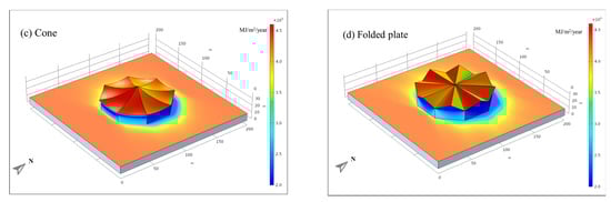 Annual solar radiation intensity of gymnasium buildings with symmetric roof shapes. (a) hemispheroid, (b) paraboloid, (c) cone, (d) folded plate.