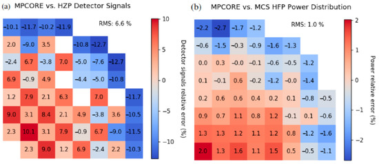 Radial distribution of errors at the beginning of cycle: (a) detector signals compared to measurements; (b) assembly-wise power compared to MCS