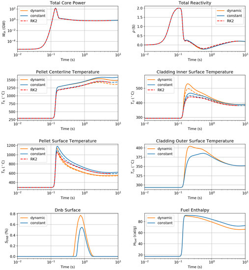 The average gap HTC at the beginning of transient was equal to 5640 W/(K) for both the dynamic and constant gap HTC cases. The fuel rod heating caused the thermal expansion of both a pellet and cladding materials. However, due to the thermal expansion coefficient difference, the pellet-cladding gap width diminished causing the gas HTC increment in two times with accordance to Equation (4). At the same time the radial HTC increased as well owing to a pellet temperature escalation. Overall, the change of the total gap HTC resulted in the flattening of the cladding and pellet temperatures, as shown in Figure 6. Subsequently, the outer surface cladding temperature for the dynamic gap HTC was larger compared to the constant gap HTC case increasing the likelihood of the DNB event and the number of channels experienced the coolant boiling. The fuel enthalpy, cladding temperature and fuel temperature calculated for both constant and dynamic gap HTC cases are presented in Table 4. Although the values of these parameters are below critical limits, the number of fuel rods with DNB events can violate the acceptance criteria for reactivity accident analysis if dynamic gap HTC model is in use. Note, the similar effect of the dynamic gap HTC has been reported recently for a PWR REA with a 1.3 reactivity insertion simulated by the CTF and BISON codes [30].