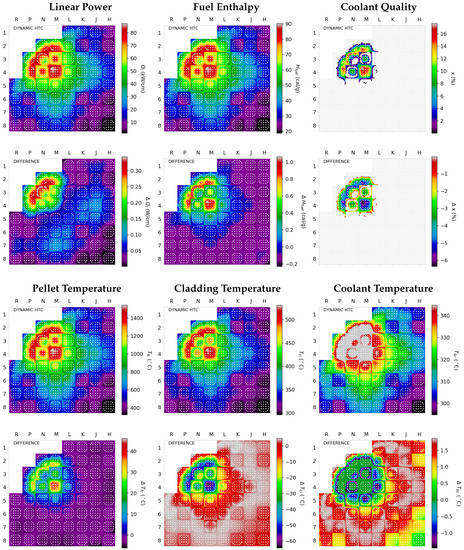 The purpose of the coupled neutronics, thermal-hydraulics and fuel performance simulation is in more rigorous calculation of the pellet-to-cladding heat transfer to improve fuel rod temperature accuracy. Therefore, in order to evaluate the multi-physics coupling effect, the transient accident is simulated two times starting from the same initial HZP state with a constant and dynamic HTC calculated by Equation (2).