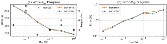 The fuel assembly was simulated by MPCORE with the constant and dynamic gap HTC models using various relative tolerances taken between and 1%, while the relative tolerance used for Picard iteration is 100 times less. The graphics of the MPCORE’s execution times and power peak errors are presented in Figure 7. The constant and dynamic models show exponential behavior on the relative tolerance; the dynamic case consumes more computation time owing to slower convergence of Picard iterations. The relative number of rejected time steps varies between 3% and 9%. The power peak value converges to approximately the same number for both dynamic and constant gap HTC indicating the initial stage of a REA transient is almost insensitive to the pellet-to-cladding heat transfer simulation.