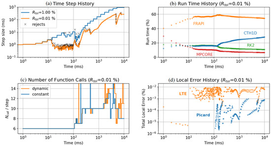Full-core rod ejection accident performance for relative tolerance : (a) time step size, (b) code run-time, (c) function calls number, and (d) local truncation error as the functions of time.