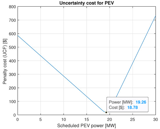 The uncertainty costs are calculated through the expected value defined in Expressions (3) and (6), modeling PEV batteries available power behavior as a normal distribution [5,7,18,19,20].