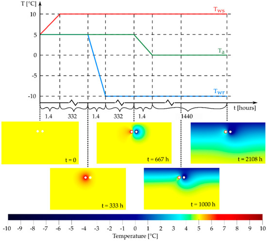 The output data of this rather complex simulation must contain enough relevant dynamics. The driving temperatures used in the training dataset along with several explanatory snapshots are shown in Figure 2. It includes fast dynamics as well as long periods of equalization, so the heat has enough time to spread and affect the relevant areas if they are thermally distant from each other. Steady-state behavior is implicitly present.