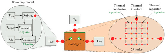 These models are then assembled into a simple grid (see Figure 3). The sparsity of the model is mostly resolved in this step. In a matrix form, the typical row would therefore have five non-zero entries, since the typical thermal capacitor is connected to four other thermal capacitors. A mathematical model of this kind should be enough to capture the macroscopic relations between variables that are recorded during the complex simulation.