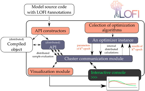 The third stage is the learning and training process. For this purpose, a custom optimization tool called Lofi was written from scratch in Python. It contains an application interface (API) to the OpenModelica compiler and several derivative-free optimizers that were also written from scratch. So far, the optimizers that were included are based on swarm intelligence and evolutionary strategies. Lofi is fully parallelized and capable of running on a distributed hardware (within a message-passing environment such as Open MPI or MPICH). Objectives and parameters subjected to optimization are annotated inside the Modelica code using the hashtags/keywords #objective and #optimize in the description of the variables (at this stage, only type Real is supported with the #optimize keyword). This overall architecture of Lofi is presented in Figure 4. The capability of Lofi is not at all limited to the problems presented in the main text of this article (see Appendix A for a short summary).