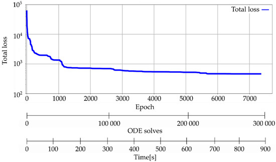 The last example shows the ability of Lofi to learn an ODE system from data. The true system (representing the unknown ODE system) is Lotka-Volterra equations (A2). The model structure, which should learn the underlying relation from the data, is an implementation of a neural network with 50 neurons in a hidden layer, and it is formed into an ODE system (see Equation (A3)). OPLES was able to train this model within eight minutes. The progress of the training is shown in Figure A3. The advantage of neural networks lies in the fact that they can be trained into almost anything, so very little prior knowledge about the underlying mechanism hidden in the data is needed. This is also its disadvantage because the optimization process is more challenging.