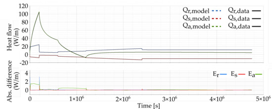 Accuracy of the new model for the validation dataset. Indices s, r, and a correspond to interfaces of supply, return, and air, respectively. The top part shows predicted heat flows from the domain to the adjacent media; the bottom part shows the absolute difference in predicted heat flow.