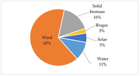 According to data from the end of 2019, the largest annual increase in the generated capacity was achieved by the photovoltaic sector, increasing the capacity of solar installations more than three times to 478 MW [7]. In this area, further growth can be expected, resulting from government co-financing programmes. An increase was also recorded in the energy generated from biomass. The situation of other sources whose capacity remains at the same level or falls (water energy) is unfavourable. The share of individual energy sources in the total capacity of RES installations in Poland is shown in Figure 2.