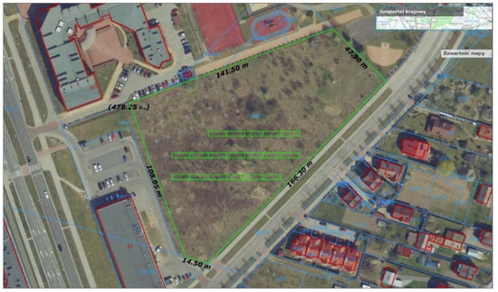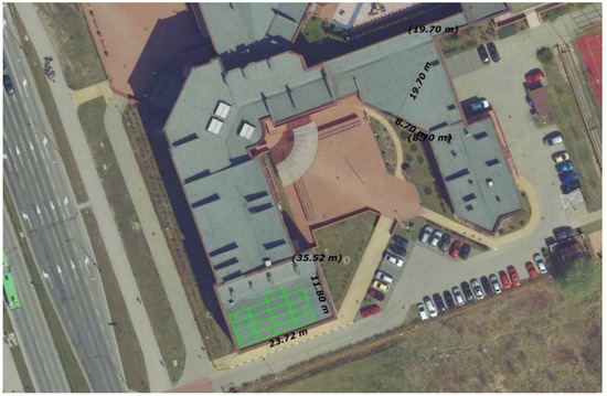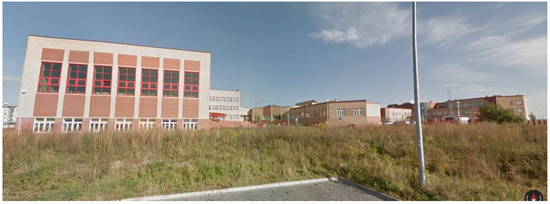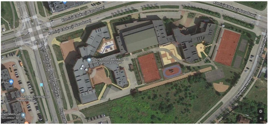 The building for analysis was pointed out by the local city hall, after setting out the most important criteria to be met. These criteria were: the function of the building—school building, a relatively new building, not requiring modernisation, with low consumption of thermal energy for heating per unit area of the building and access to its consumption data for the previous years. The building also had to be self-billed for electricity and heat consumption. The building for which the installation concept has been proposed is a three-storey building, made in brick technology. The building was built in 2010. The area of the building and the heated area is 8260 m2 and it has 1400 users. It is located in the north-east of Poland, at 53°05′ N latitude and 23°09′ E longitude. The area has a continental climate with harsh winters and hot and dry summers. The average annual temperature is 6.8 °C. The average temperature of 17.3 °C makes July the warmest month of the year. January has the lowest average temperature during the year. It is −5.0 °C. The energy consumption for heating purposes per unit of building area is 0.21 GJ/(m2∙year). In the case of electricity, the area demand is about 13 kWh/(m2∙year). It is possible to reduce this value to 8 kWh/(m2∙year), after a hypothetical replacement of lighting with LEDs (estimated value based on data from three lighting refurbishments in educational buildings in Poland). The daily heat demand for hot water preparation is about 4 GJ. An additional positive aspect of this particular building is the adjacent, not shaded city plot of 1.30 ha on the southern side, giving additional possibilities of arranging RES systems. The location of the building is shown in Figure 3, and the elevation is shown in Figure 4.