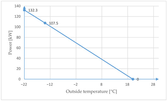 The ground source heat pump was selected, taking into account the monthly heat capacity demand recorded in December, which amounted to 347.8 GJ, calculated in terms of the power demand being 132.3 kW. Standard PN-EN 14,825 [36] introduces the division of European territories into three climate zones. The location where the building is located belongs to zone C (cold zone), with the external design temperature Tdesign,h = −22 °C. The bivalent temperature in the cold zone Tbiv = −14 °C is assumed, according to the recommendations of the standard [25]. The method of determining the bivalent point for the calculated power demand to cover the total energy demand is shown in Figure 5.