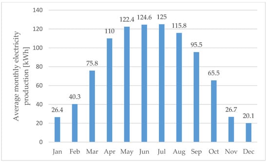 The electricity production forecast was carried out for a 1 kWp south-oriented photovoltaic installation using the interactive tool Photovoltaic Geographical Information System (PVGIS). The PVGIS provides access to solar radiation data, the forecast of the daily and monthly average performance of the system at a given location and the given parameters. The application also offers ready-to-print maps of photovoltaic resources and potential by country and region and includes typical meteorological data. The tilt angle of the panels has been optimised automatically and is 38°. The results of the forecast of energy production from 1 kWp of the installation are shown in Figure 6.