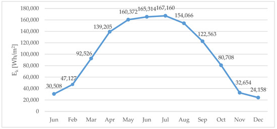 The solar system will be used to prepare domestic hot water. The possibility of storing excess energy in the summer using BTES technology has been analysed. The values of irradiation (Ek) in the analysed location in particular months of the year are shown in Figure 8. These are the average values of irradiance for an optimized slope angle 38°, for each month over the years 2005–2016 based on PVGIS database.