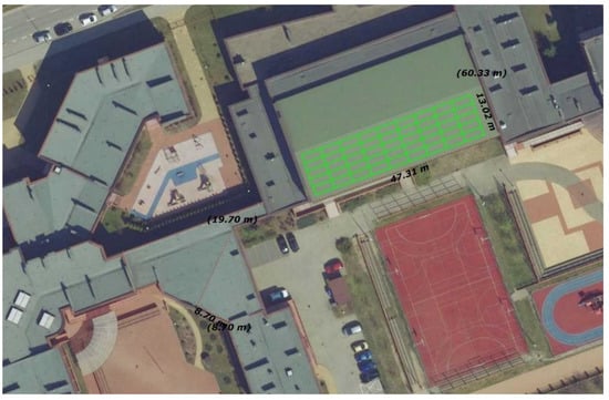 Taking into account the heat demand for hot water preparation for 1400 school users, the average irradiance in the year and the system efficiency of 57% of the required area of the solar collectors being , the estimated demand requires the installation of 62 large-area flat-plate collectors with a total absorption area of 584.04 m2. The collectors will be laid on frames providing an optimal slope of 38 degrees placed on the roof of the building from the south side. The arrangement of the collectors is shown in Figure 9 and Figure 10.