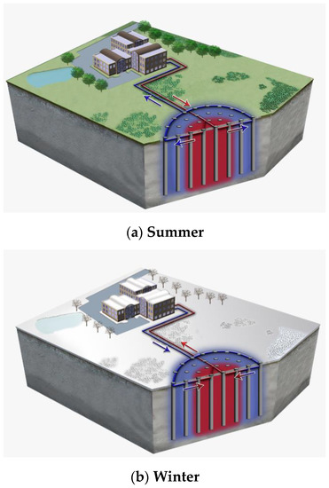 BTES is an improved system compared to conventional geothermal heat pump systems. The ground source heat exchanger system is designed in such a way that the heat is stored and extracted successively, using the ground as heat storage. This is achieved by an appropriate configuration of the ground heat exchanger system and seasonal reversal of the medium flow direction [43]. The BTES system operation cycle includes the energy storage phase schematically shown in Figure 11a and the energy recovery phase shown in Figure 11b. In the first one, the supply medium temperature is higher than the return medium temperature. In the second, the heat energy from the storage is transferred to the heating system via the heat pump.