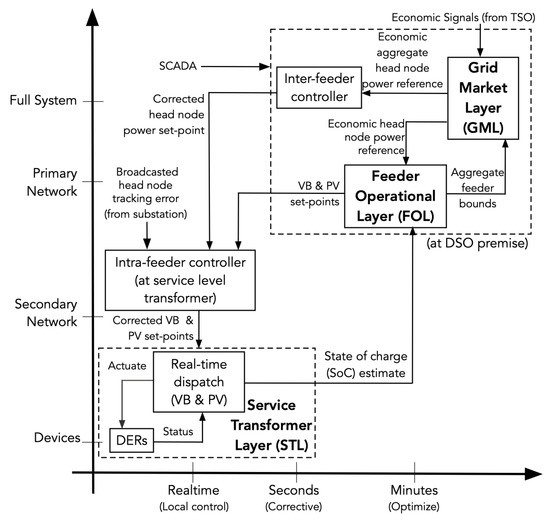 Together, the three layers (GML, FOL, and STL) mirror the voltage hierarchy of the DSO’s HV, MV, and LV system interfaces, which aligns with the Market DSO model described above and enables a scalable approach to manage millions of controllable DERs across a DSO’s entire system. Besides, the alignment permits utilization of a DSO’s secure and low-latency communication network between sub-transmission nodes (i.e., GML elements), distribution substation nodes (i.e., FOL elements), and service transformer nodes (i.e., STL elements). Specifically, we leverage the communication system to design and employ a proportional intra-feeder control scheme that provides sub-second updates to the FOL’s VB power set-points to correct for forecast errors and model mismatch. Furthermore, to account for model mismatch in the GML, the DSO’s SCADA system is employed to provide sub-minute inter-feeder corrective updates to the GML’s economic power set-points of feeder head-nodes. The key contributions of this manuscript include the following: