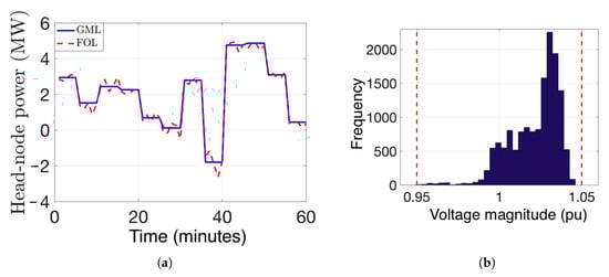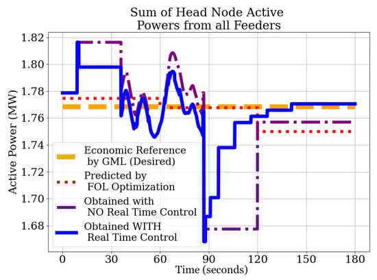 The second layer in the hierarchy is the FOL, which employs a three-phase distribution network model of the primary network (i.e., an unbalanced feeder) to optimize PV and VBs’ power set-points every 1 min to 5 min and ensure voltage and current limits are satisfied [27,28,29]. The objective of the FOL is to coordinate the flexibility of the responsive VBs and PV inverters with the (mechanically actuated) legacy control devices, such as capacitor banks (CBs) and on-load tap changers (OLTCs), to reshape net power exchanges at the feeders’ head-nodes (i.e., at the distribution substations) in response to economically optimized power set-points provided by the GML, which updates every five minutes and represents the top level of the hierarchy.