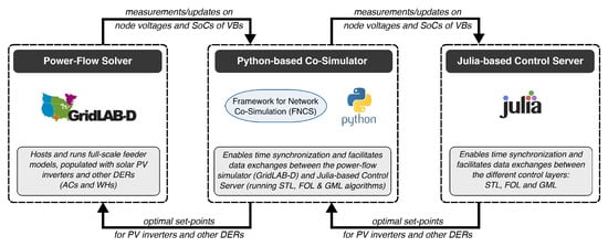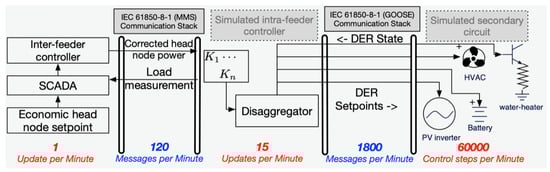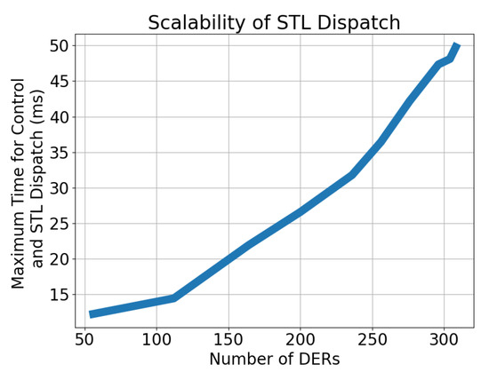 Future work will focus on studying performance guarantees within and between the different layers, which has not been developed. Specifically, the GML would benefit from optimality guarantees for convex OPF-based methods that have been employed to optimize the meshed sub-transmission networks. In addition, the proposed utility-centric approach places a large technological (data processing, communication, control) burden on the utility and limits participation of independent DER owners and aggregators, which creates regulatory challenges. Furthermore, given the optimization-based methods employed in the FOL and GML, the approach is also limited to slower (minutely) market signals and not suitable for dispatching controllable resources against fast TSO signals like frequency regulation (e.g., updated every 2–4 s by the TSO). To overcome these challenge, ongoing work is considering new optimization methods that implicitly embed AC grid constraints into nodal capacity bounds for controllable grid resources that then enable a real-time controller to determine a DER’s participation factor to a feeder’s desired power set-point [71]. This would also allow utilities to offer their (dynamic) hosting capacity as a market product to independent DER owners and aggregators and create new market-based services for flexible demand. The authors are also interested in extending the STL’s deterministic characterization of VBs to incorporate stochastic elements and more diverse DER populations, along the line of [26]. Finally, the simulation setup may be useful for exploring more scenarios that may be of value to utilities and regulators.