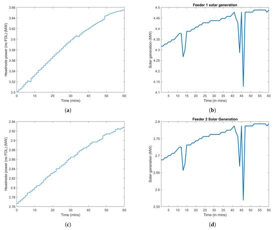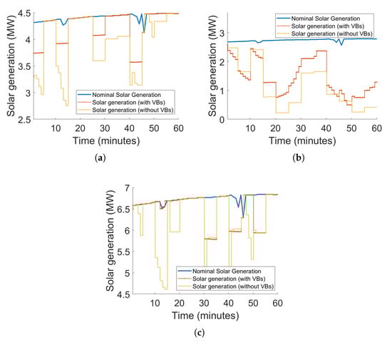 Total solar PV output from all nodes during peak hour (11:00 to 12:00) in the FOL. (a) Feeder 1. (b) Feeder 2. (c) Feeder 3.