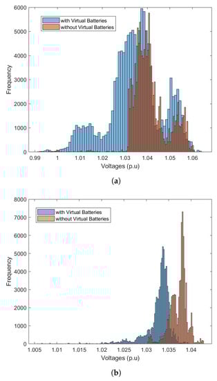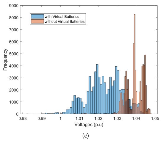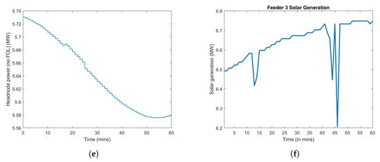 Figure 17 shows the FOL tracking performance across all the three feeders and is quantified in Table 4. Overall, the tracking errors for each fully modeled feeder ranges from 14–90 kW (RMSE), which is low relative to the MW-scale net-load of the feeders. However, feeder 3’s larger tracking error in Figure 17c is due to the GML forecasting far more solar PV from feeder 3 than is realized at time 20 and 35 min, which drives up the net-demand at the head-node. Had the inter-feeder controller been active in this simulation, we would expect to see the other feeders correct their head-node set-points down to make up for the GML’s desired aggregate head-node demand. Nonetheless, the FOL is able to maintain the nodal voltage magnitudes within the ANSI bands with a probability of 0.95 with the use of VBs (Table 4). Figure 18 provides a comparison of the nodal voltage distribution with and without virtual batteries. The voltages tend to higher values in the absence of virtual batteries due to high solar PV penetration levels in all feeders. Figure 19 shows how VBs’ state trajectories evolve over the peak hour for all three feeders and represent the device-level energy/comfort constraints (i.e., no violation of [0,1] bounds implies no violation of device constraints). Given the full range of utilization of the VBs, it is clear that the FOL utilizes the available flexibility. The overall PV output during the peak hour is shown Figure 20 and illustrates how VB flexibility allows the FOL to reduce the level of solar PV curtailment and more closely track GML set-points (see Table 5).