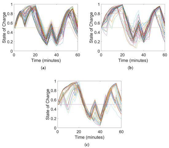 Evolution of the VBs’ normalized state of charge during peak hour in the FOL. (a) Feeder 1. (b) Feeder 2. (c) Feeder 3.