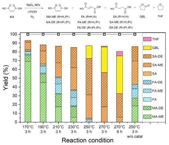 - Jang, J.H.; Sohn, H.; Camacho-Bunquin, J.; Yang, D.; Park, C.Y.; Delferro, M.; Abu-Omar, M.M. Deoxydehydration of Biomass-Derived Polyols with a Reusable Unsupported Rhenium Nanoparticles Catalyst. ACS Sustain. Chem. Eng. 2019, 7, 11438–11447. [Google Scholar] [CrossRef]