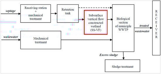 The literature describes the problem of the negative impact of an excessive pollutant load in septage on the process of biological wastewater treatment [6,7]. The most serious problems occur in small, hydraulically unloaded WWTPs [8,9]. The real pollutant load significantly differs from the design assumptions, which causes serious disturbances in the operation of activated sludge and trickling filters [10]. This, in turn, threatens the quality of treated wastewater and, in extreme cases, failure of the entire system. So far, the problem has not been solved by equipping the WWTP with receiving stations and retention tanks. While searching for a solution to this problem, the application of a subsurface vertical flow constructed wetland (SS-VF) was proposed for pre-treatment of septage before its input into the biological section of a municipal WWTP (Figure 1).