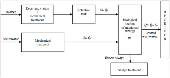 Mechanically treated wastewater with concentration S2 and quantity Q2 is fed into the biological section of a WWTP. There, the mixture of septage (Q1, S1) and wastewater (Q2, S2) undergoes a treatment process with efficiency η2, allowing to reduce the concentration of pollutants in wastewater discharged into the receiver (Q1 + Q2) to the maximum permissible level (Sp).