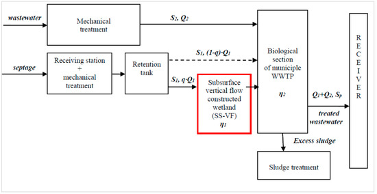 Septage is fed into a receiving station equipped with a mechanical treatment device and then into a retention tank from where, after averaging the concentrations to S1, the amount of Q1 is directed to the biological treatment. The part of that total septage quantity (Q1 · q = Q1′) is input into the SS-VF bed, where it is pretreated with efficiency η1. The rest of the septage {(1 − q) · Q1)} is transferred directly into to the biological section of a WWTP. The optimization task is to determine the optimal coefficient of septage stream distribution q = Q1′/Q1. For technological reasons, the same septage should be directed to the biological section of a WWTP and excluded from optimization. This is important in the case of large WWTPs, for which a high efficiency of nutrient removal requires addition of an external carbon source [28]. Organic compounds contained in septage may provide an external carbon source for the denitrification process.