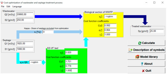 The issue of optimization is solved by “Cost optimization of wastewater and septage treatment process”, a computer program prepared for this purpose (programmer Malinowski P). It calculates the value of K(qi) for each variable qi = iε, assuming the discretization of decision variable q with the step ε = 10−6, where i = 0, 1, 2, ..., (1/ε). It then selects the value of qi for which the cost reaches the minimum value. In the next step, the value of η2 is calculated according to previous equations.