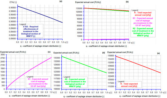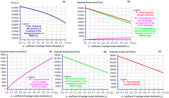 For the data from example two, considering the criterion of the minimum expected annual cost of treatment, the optimal solution will be to direct the total amount of septage to the SS-VF bed (q = 1). This will allow to reduce the required effectiveness of treatment in the biological section of the WWTP (η2) in the BOD5 index from 94.5% to 89.5% (Figure 8a). Figure 8b summarizes the dependence of costs (K1, K2, K) on the value of the decision variable (q). As the value of the decision variable (q) increases, the annual cost of septage pre-treatment in the SS-VF bed (K1) increases (Figure 8c), and the cost of treatment in the biological section of WWTP (K2) decreases (Figure 8d) together with the total cost of treatment (K) (Figure 8e). Comparison of costs in variant zero and in alternative variant is presented in Table 2.