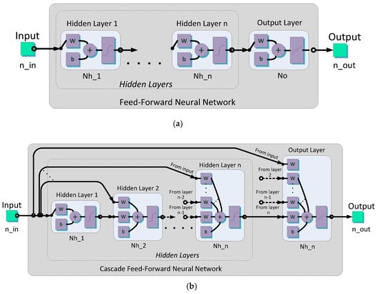 Proposed artificial neural networks (ANN) architectures: (a) feed forward and (b) cascade feed forward classes.