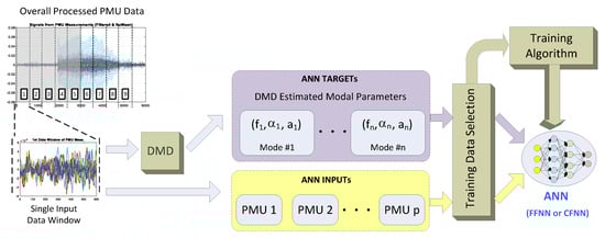 As appropriate for supervised learning architectures, the developed ANN must be trained to provide suitable regression (i.e., in this case estimation) features. The basic scheme reported in Figure 3 illustrates how both types of ANN should be trained to be able to correctly identify the modal parameters of the LFO contained in the PMU measured data.