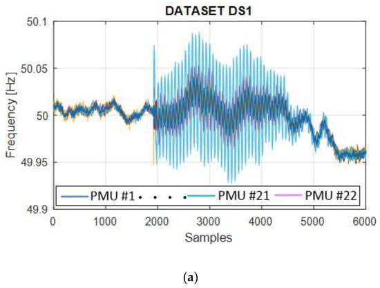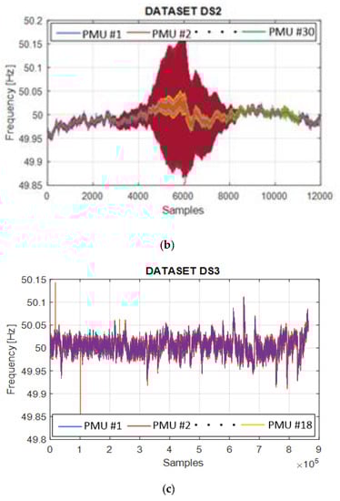A high-level outlook of the three datasets employed for this study is given in Figure 4. The first two datasets (Figure 4a,b) are characterized by ringing phenomena of the frequency measurements, especially at certain PMU locations. The third dataset instead is similar to the recording of nominal (also named as “ambient”) conditions where some spurious frequency deviations occur from time to time.