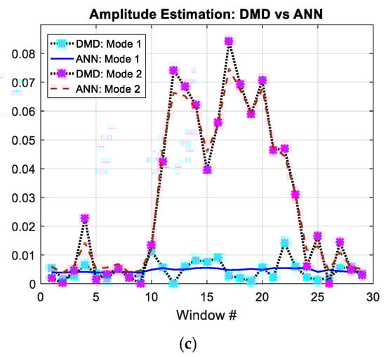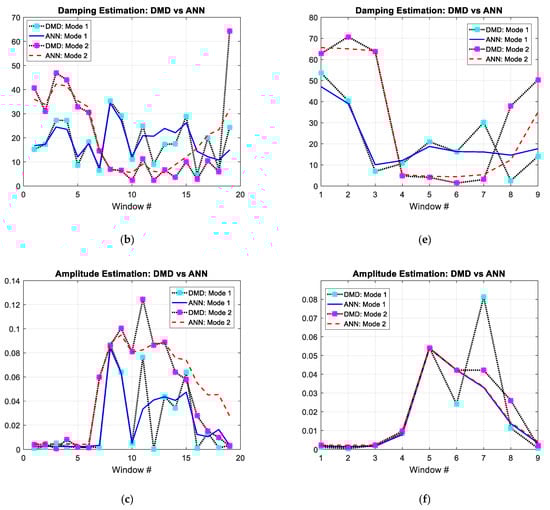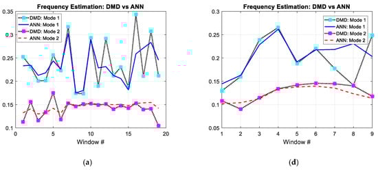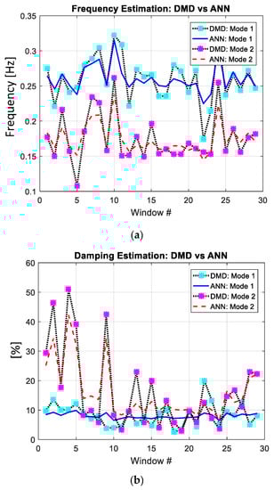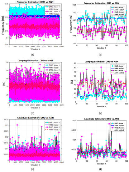 Figures from Figure 7a–c show the ANN and DMD results for all the 4381 windows. Although not easily distinguishable, they offer an overview of the overall trend of the ANN estimation and their comparison with the reference DMD. Figure 7d–f makes a focus on only 100 windows; also in this case the estimations provided by the ANN-based method closely follow those provided by the DMD method. The agreement between ANN and DMD results is very good for mode #1, the mode with less energy (blue line vs. light blue markers) and acceptable for the dominant mode #2 (dashed red line vs. purple markers). One aspect that should be underlined is that, even though there is a close tracking of the main trend of the estimates produced by the ANN with that of the DMD procedure, there are small difference between the two outputs. It is worthy to note that the estimations generated by the ANN-based approach are characterized by a smoother variation of the mode parameters, close to what happens in the real phenomenon.