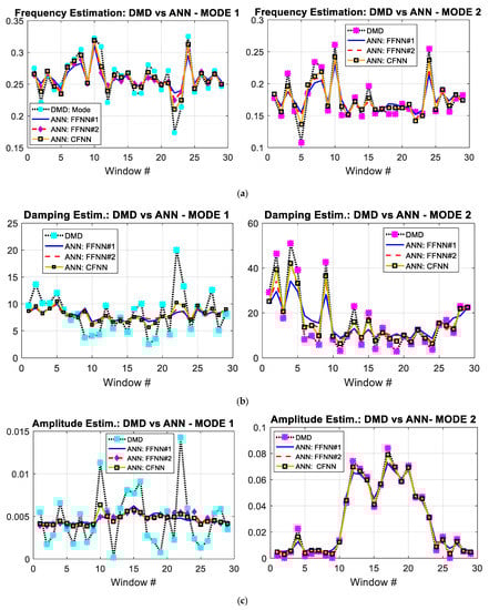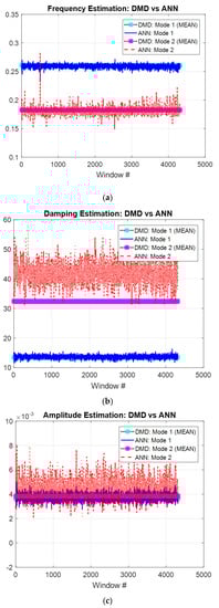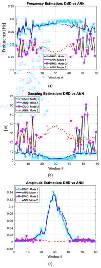 Comparison of the estimates produced by DMD versus the estimates produced by the ANN approach for the case of Dataset DS2: (a) frequency; (b) damping, (c) amplitude.