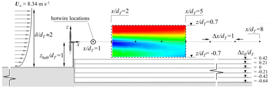 At the turbine location, the mean incoming flow velocity at hub height was set to = 8.45 m s, resulting in a TBL with a roughness length ≈ 0.12 mm, and a thickness 2 (see additional details in Liu et al. [39]). Figure 2 illustrates dimensionless vertical profiles of the incoming flow , turbulence intensity and kinematic shear stress of the boundary layer near the turbine location; here, is the streamwise velocity fluctuations’ standard deviation.